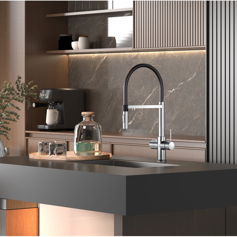 Кухненски смесител с две ръкохватки за чиста вода, с хромирано покритие, с изтеглящ се душ с 2 функции, силиконов чучур, Sedal 35 мм, аератор Neoperl M24, комплект гъвкави връзки (SS201) и монтажен комплект