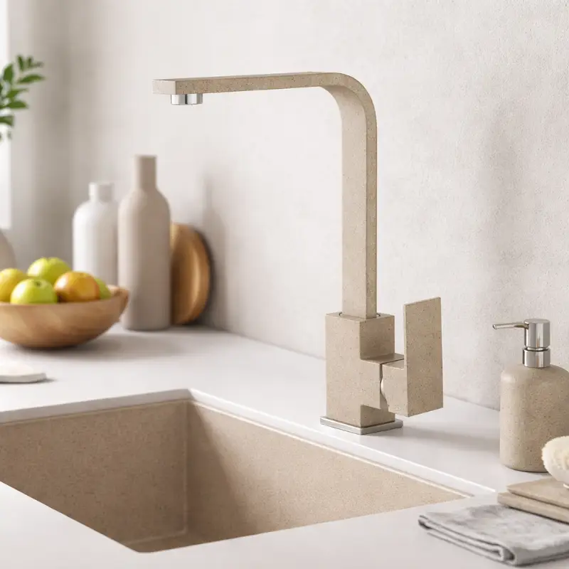 Кухненският смесител Inter Ceramic ICF 233010 SAND е модерно решение за съвременни кухни, съчетаващо стилен дизайн и практичност. Пясъчният цвят с гранитно покритие се комбинира отлично с гранитни мивки и светли кухненски плотове.