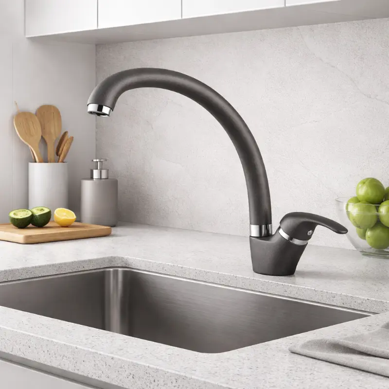 Кухненският смесител Inter Ceramic ICF 237012 GREY е практичен избор за модерна кухня, в която се търсят удобство, изчистена визия и надеждна ежедневна употреба. Тъмно сивият цвят с гранитно покритие се съчетава отлично с гранитни мивки, тъмни плотове и съвременни кухненски интериори.